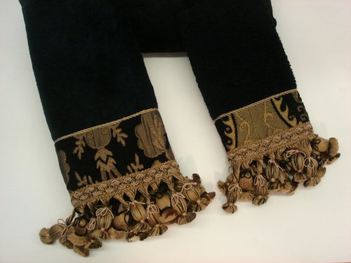 Features with Cord & Fancy Ball Fringe.Available in black color towel with gold-colored band.Made in U.S.A. - 100% Cotton - Velour Quality.Add a final touch to your bathroom with a new stylish Sherry Kline Decorative Towel Set..3-pc Decorative Towel Set includes 2 Embellished Towels (Hand and Tip) and 1 Unembellished (Plain) Bath towel...