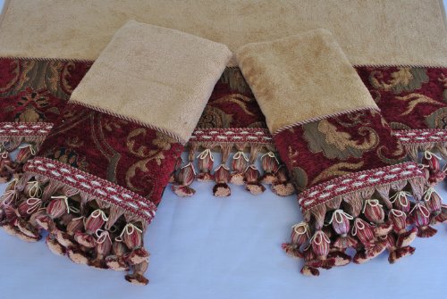 This three-piece Sherry Kline China Art Red Luxury Gold velour towel set features luxurious embellished Gold towel band with gold gimp and onion ball fringes..Spot clean recommended..Set includes: Bath towel, hand towel, and one fingertip towel.These fashion towels are a great addition to any bathroom decor..Proudly Made in U.S.A...