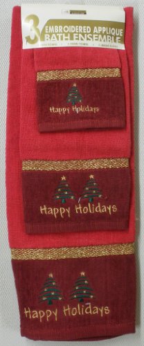 RED WITH GREEN CHRISTMAS TREES 3 PIECE BATH TOWEL, HAND & WASH CLOTH SET HAPPY HOLIDAYS TOWELS Feature