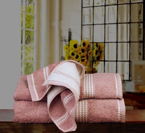 Set includes; Guest-Towel, Hand-Towel, Bath-Towel in 600-grams plush weight..Cotton..Soft touch, plush weight, superior absorbency, has no lint or piling tendencies, machine washable, color fast..Color: Bi-face (Soft Lilac/White).Weaved in Jacquard sophisticated Bi-face Technique...