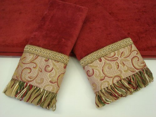Add a final touch to your bathroom with a new stylish Sherry Kline Decorative Towel Set..Made in U.S.A. - 100% Cotton - Velour Quality.Available in red color towel with red-colored band..3-pc Decorative Towel Set includes 2 Embellished Towels (Hand and Tip) and 1 Unembellished (Plain) Bath towel..Features Cord & Ribbon Fringe band...