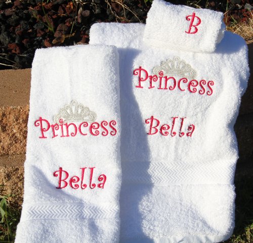 Wash Towel = 13.5" x 13" Embroidery design = Princess and Crown is 6" x 4", name per order Hand Towel = 29" x 16" Bath Towel = 51.25" x 31" 3pc set: Bath, Hand and Wash Towel