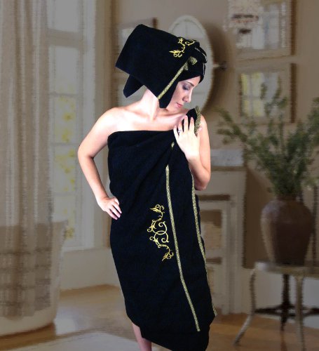 Made in Europe. Color: Black with Gold medallion and decorative borders. Machine Washable, Color Fast. No lint or Piling Tendency. One Piece Guest Towel (12x14 inches) Hand Towel (19x27 inches) Bath Sheet (39"x60 inches). Cotton. Soft touch combed cotton with superior absorbency.