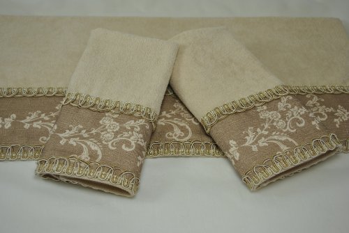 These fashion towels are a great addition to any bathroom decor. Set includes: Bath towel, hand towel and fingertip towel Spot clean recommended. Three-piece Sherry Kline Winchester decorative towel set features unique circular trims in wheat towel coordinates with cotton bath, hand, and fingertip towels embellishments in linen and multi color.