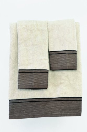 Machine wash warm and tumble dry Bath towel measures 27-1/2 by 50-inch weighs 0.6564 , hand towel measures 16 by 25-inch weighs 0.6564, tip towel measures 13 by 18-inch, weighs 0-1/2291 3-Piece towel set from Famous Home Fashions Made of 100-percent cotton with a jacquard border motif