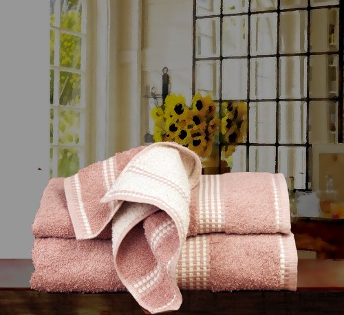 Towels-Set includes: Guest/Fingertip-Towel (12x14 inch), Hand Towel (19x27 inch), Bath Towel (27x54 inch) in plush 600grs/m2 weight. Weaved in Europea in Jacquard bi-face sophesticated technique. wash separately the first 3 times Soft touch combed cotton with superior absorbency. Machine Washable, Color Fast. Color: Bi-face (Light Lilac/White)