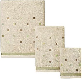 3-pc. Set; Includes Bath Towel, Washcloth, Hand Towel 100% Cotton Terry Features Embroidered Detail Square Pattern Green, Beige Tumble Dry, Do Not Bleach, Machine Wash Cold